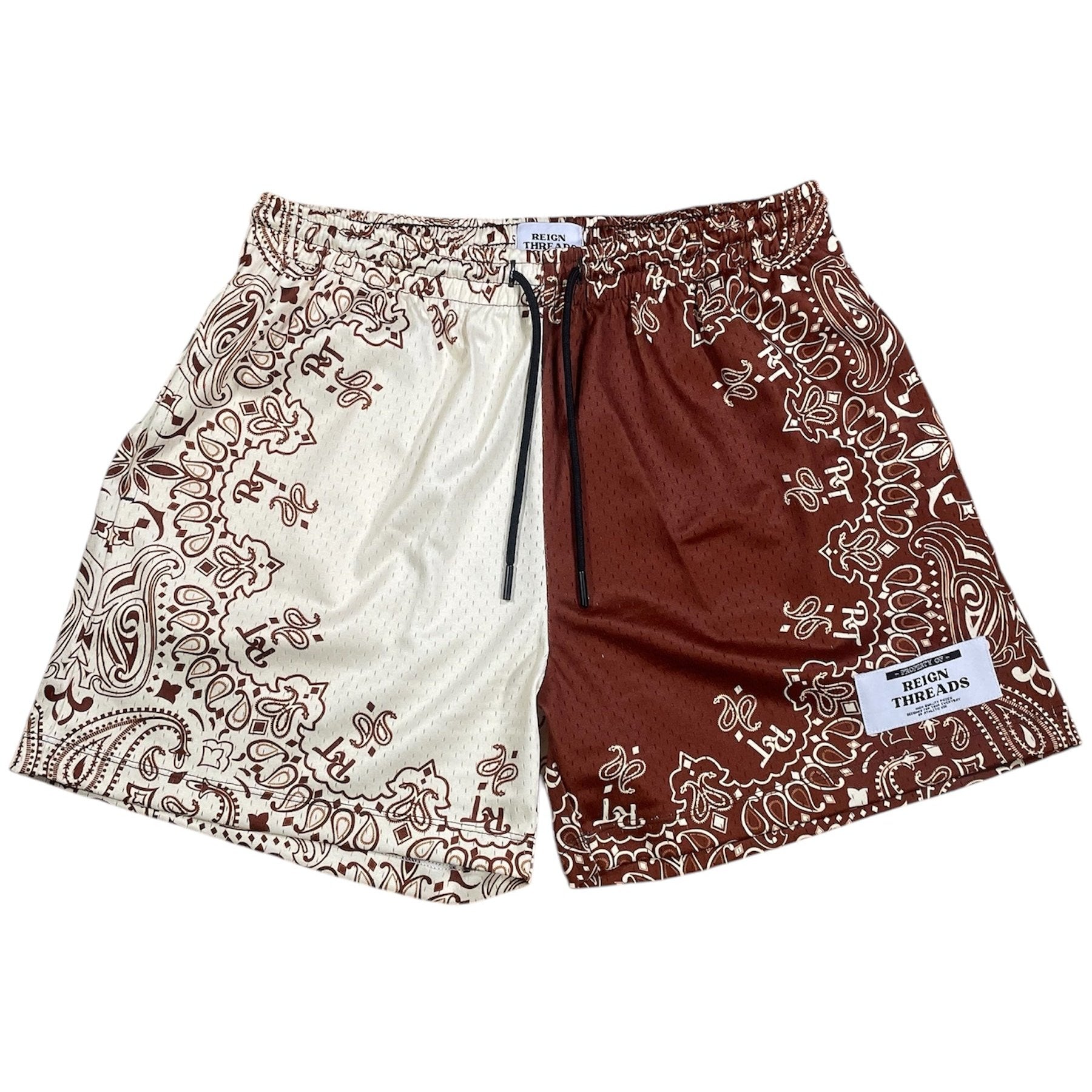 These brown and tan mismatch mesh shorts have a 5 inch inseam, providing optimum comfort and breathability for your workouts. Made from high-quality material, they are durable and perfect for any athletic activity. Stay cool and focused with these shorts, designed for maximum performance.
