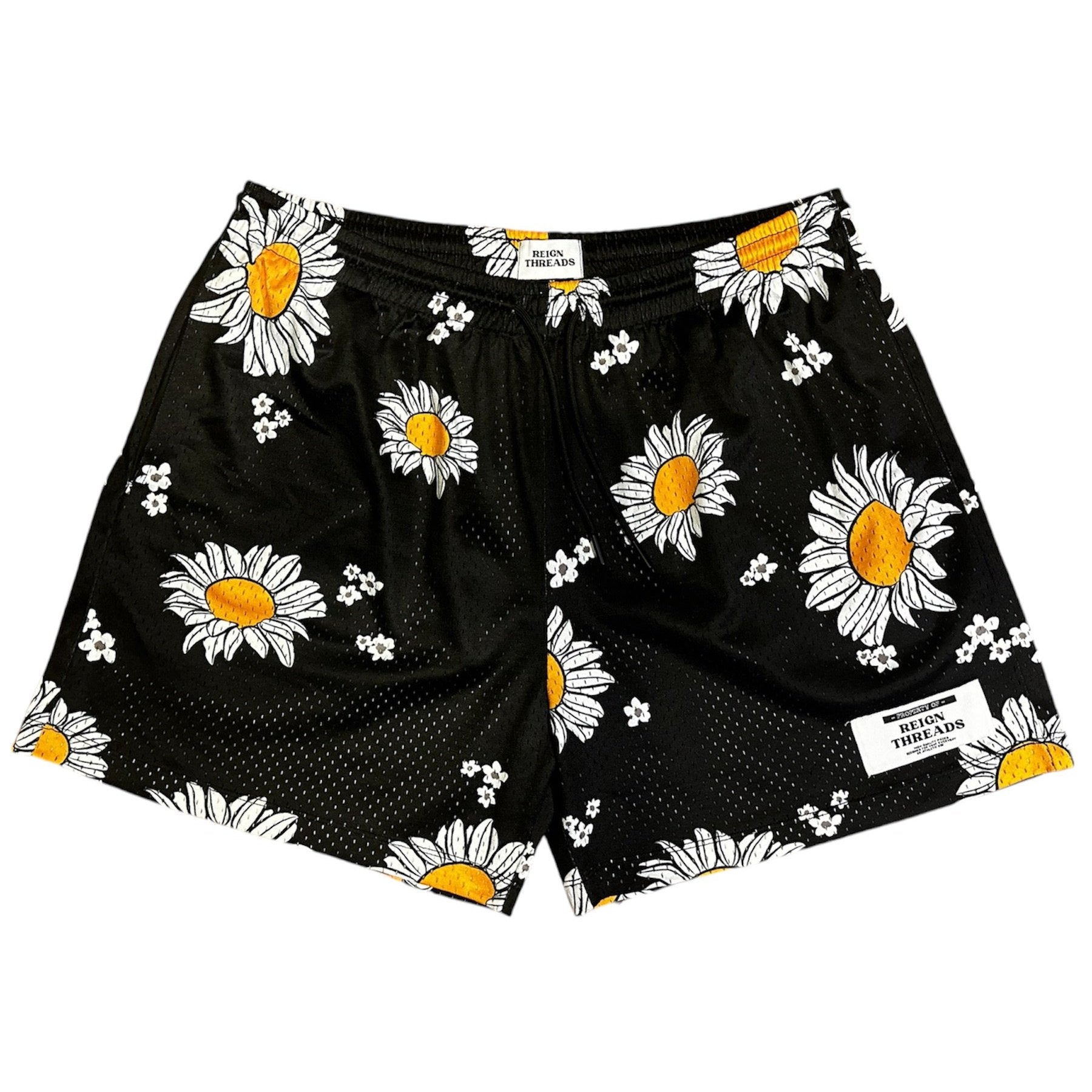 These white sun flower mesh shorts have a 5 inch inseam, providing optimum comfort and breathability for your workouts. Made from high-quality material, they are durable and perfect for any athletic activity. Stay cool and focused with these shorts, designed for maximum performance.