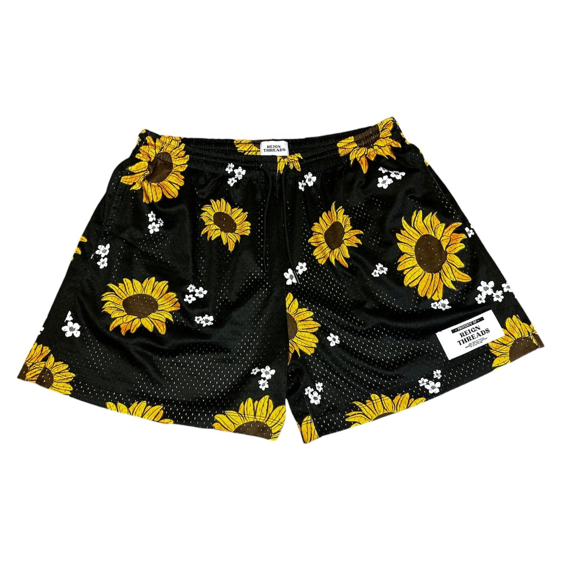 These yellow sun flower mesh shorts have a 5 inch inseam, providing optimum comfort and breathability for your workouts. Made from high-quality material, they are durable and perfect for any athletic activity. Stay cool and focused with these shorts, designed for maximum performance.