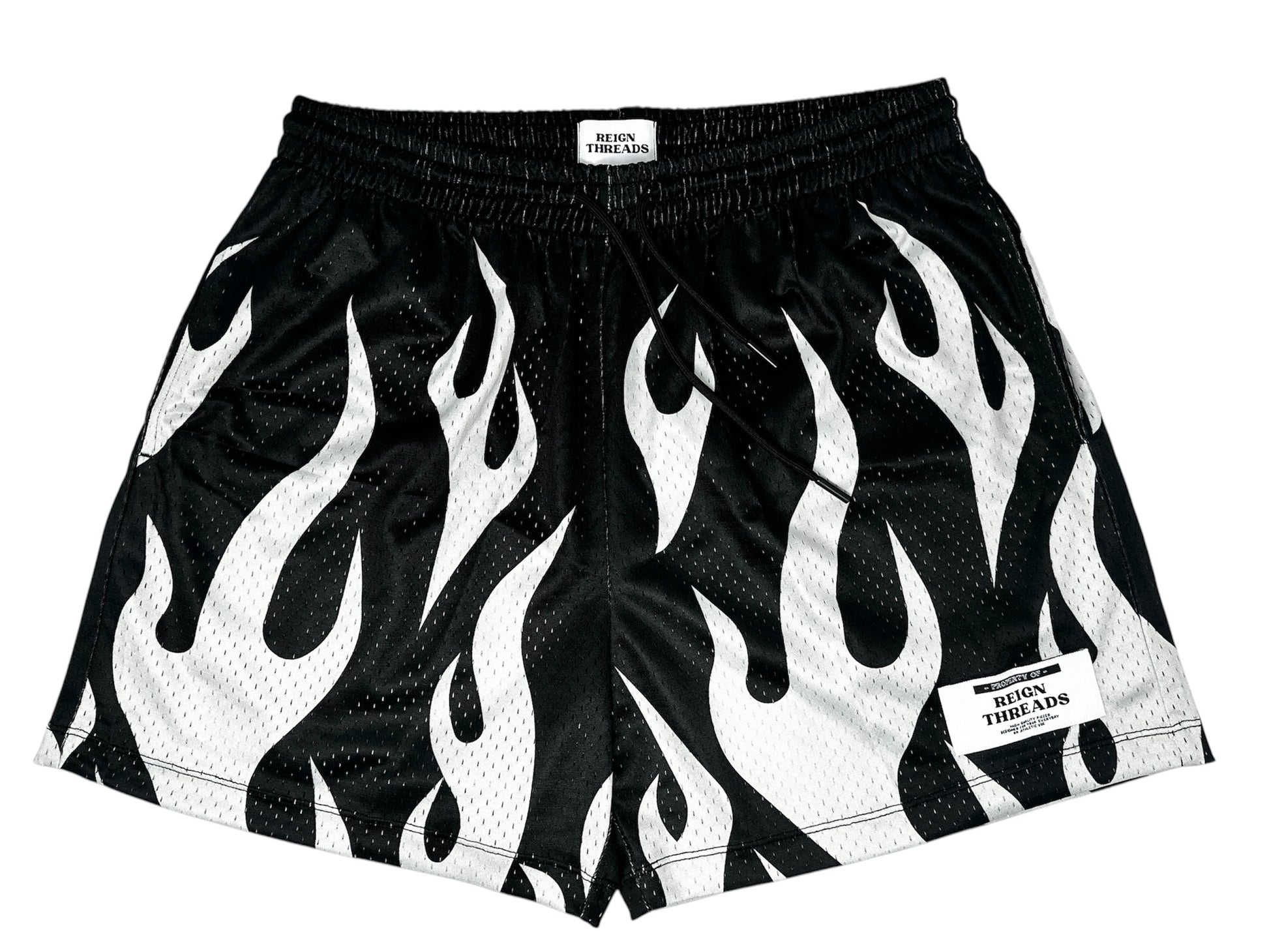 These black and gray flame mesh shorts have a 5 inch inseam, providing optimum comfort and breathability for your workouts. Made from high-quality material, they are durable and perfect for any athletic activity. Stay cool and focused with these shorts, designed for maximum performance.
