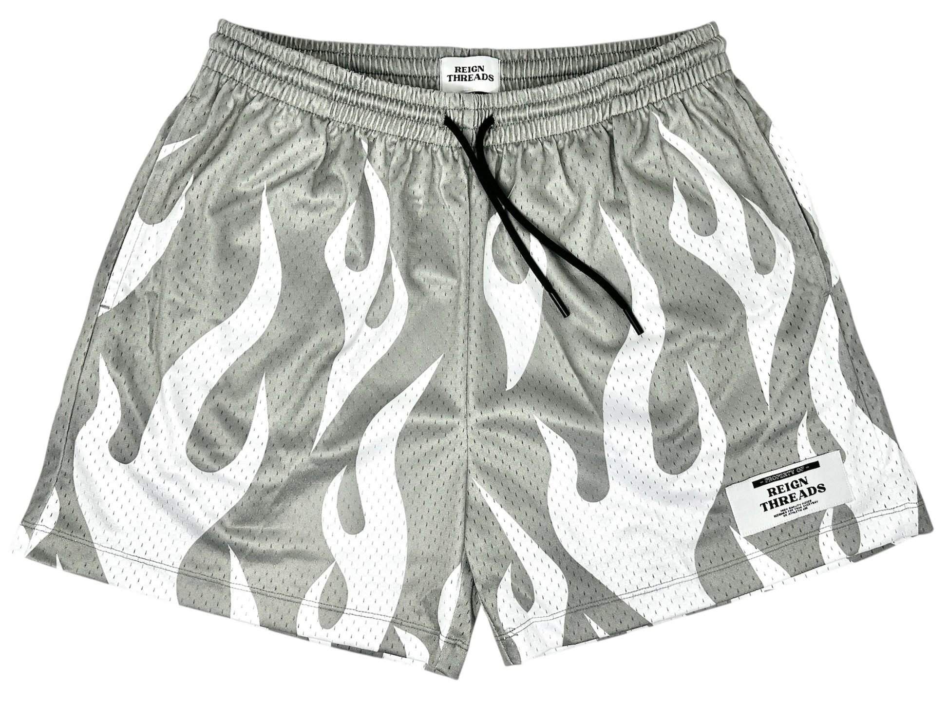 These gray and white flame mesh shorts have a 5 inch inseam, providing optimum comfort and breathability for your workouts. Made from high-quality material, they are durable and perfect for any athletic activity. Stay cool and focused with these shorts, designed for maximum performance.