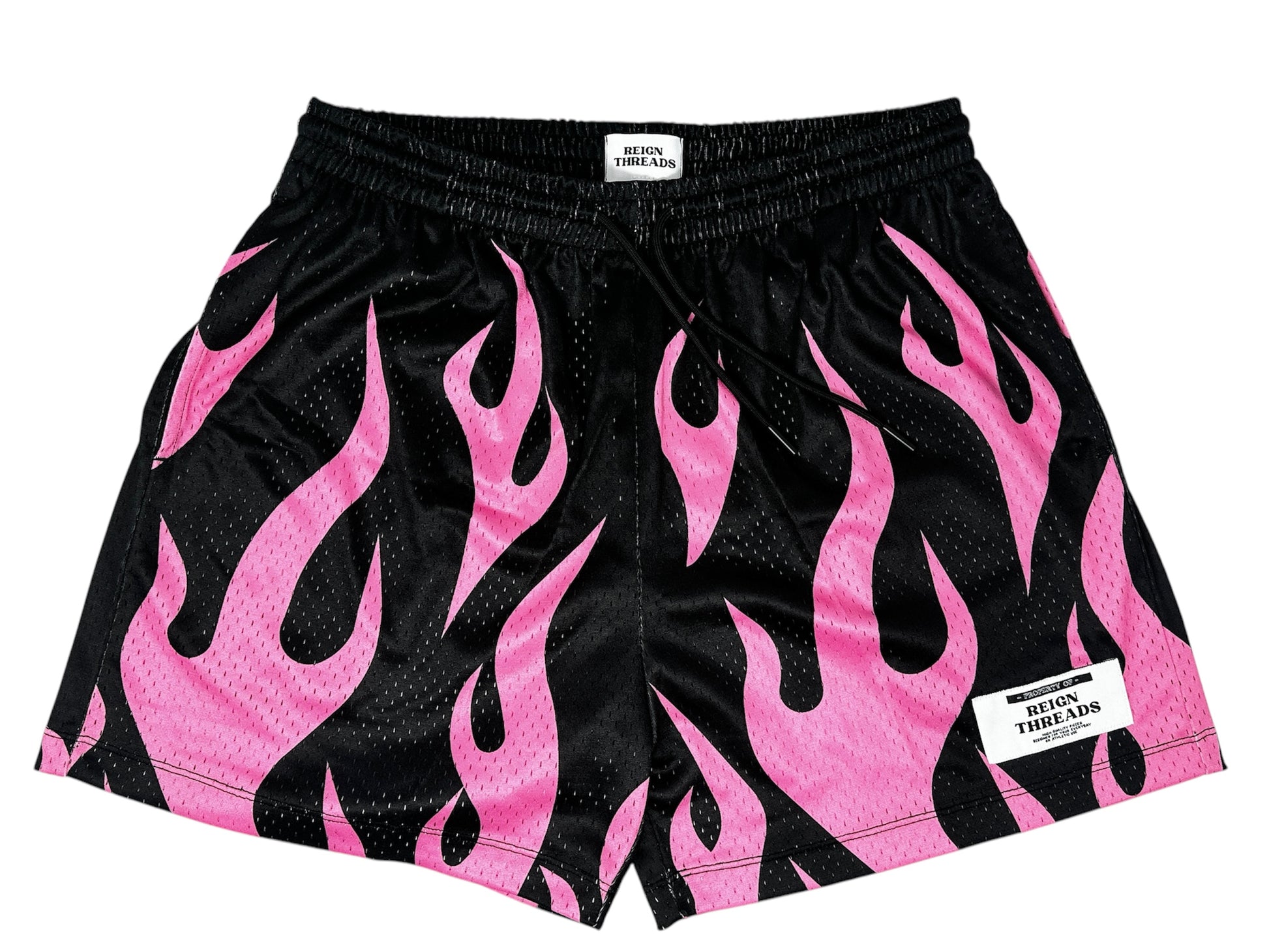 These pink and black flame mesh shorts have a 5 inch inseam, providing optimum comfort and breathability for your workouts. Made from high-quality material, they are durable and perfect for any athletic activity. Stay cool and focused with these shorts, designed for maximum performance.